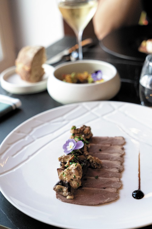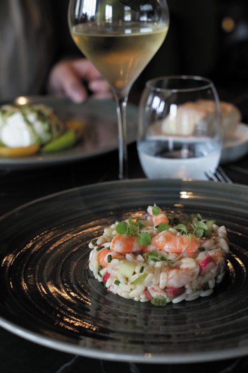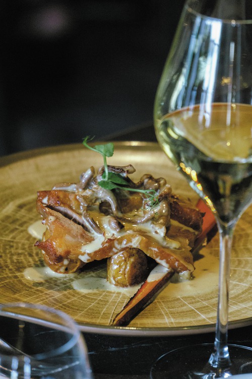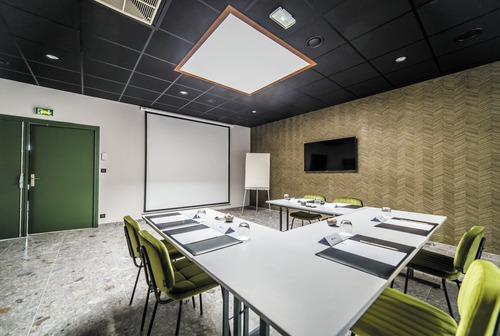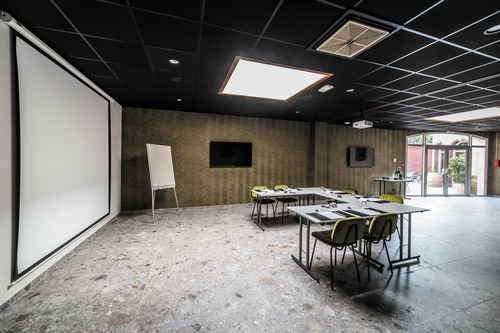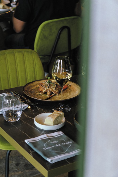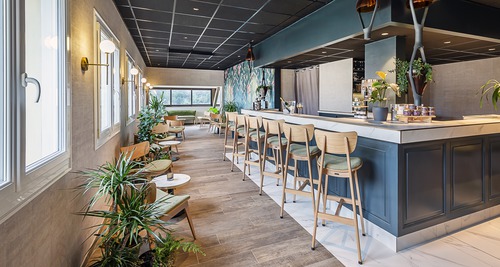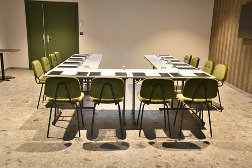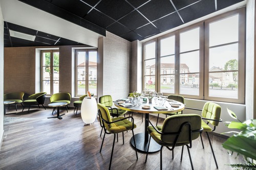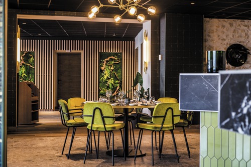 de gemeenschappelijke ruimtes, ingericht met een palet van goudgele tinten, weerspiegelen het erfgoed en de cultuur van de Champagnestreek. In de champagne-bar Balthazar is het gezellig vertoeven met een drankje, sommige avonden in het gezelschap van live jazzmuziek. In een elegant kader serveert Restaurant Terre de Craie een streekgebonden keuken op basis van lokale en seizoensgebonden producten. Ontspannen kan in de wintertuin of op zomerse dagen op het terras. Ondergronds fietslokaal (20 plaatsen).