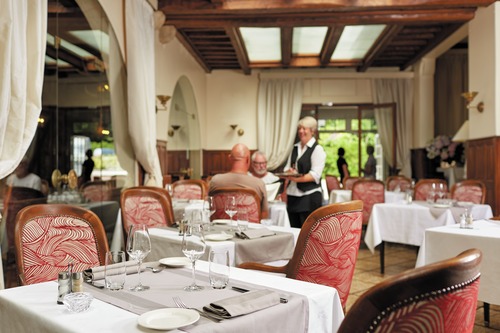 via de hoofdingang stapt u meteen de geschiedenis binnen. Naast het hotel bevindt zicht het restaurant Les Trois Marchands waar een traditionele, gastronomische keuken met verse producten worden verwerkt tot authentieke gerechten. Er is een aangenaam zomerterras voor het hotel. Tijdens de winter zorgt de grote open haard in het restaurant voor warmte en welbehagen. In de omgeving: golf (18 holes) en paardrijden op 3 km.